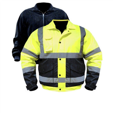 Class 3 Hi-Visibility 3-in-1 Bomber with zip-out fleece liner is three jackets in one! High denier nylon shell with DuPont Teflon fabric protector is durable and resists water, mud, grease and dirt. Shell is lined with quilted 4 3/4-oz. polyfill for warmth. Has heavy-duty nylon front zipper with button-close storm flap, left chest pocket and front cargo pockets with pass-behind handwarmer pockets. Class 3 approved silver reflective stripes over shoulders, around torso and arms. Meets ANSI 107-2010 specs. Zip-out black fleece liner can be worn alone or with shell. Features handwarmer pockets, elastic cuffs and nylon front zipper.
